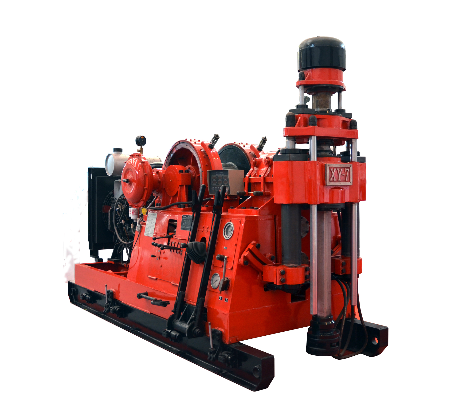 XY-7型钻机是我公司新研发的机械传动液压给进立轴式岩心钻机,主要用于金属、非金属固体矿床勘探及金钢石小口径钻进,亦可用于大口径合金钻进;可钻垂直孔和倾斜孔,也可用于水文、油气田的勘探及工程钻孔。XY-7型钻机的研制,填补了我公司立轴式岩芯钻机2500米左右深孔钻孔空白,完善了我公司立轴式岩心钻机的系列化,方便用户选择。